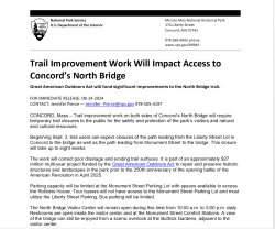 CONCORD, Mass – Trail improvement work on both sides of Concord’s North Bridge will require temporary trail closures to the public for the safety and protection of the park’s visitors and natural and cultural resources.