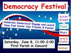 Join your fellow citizens to celebrate democracy! Come to First Parish in Concord, 20 Lexington Road, on Saturday, June 8 from 11:00 am – 2:00 pm.