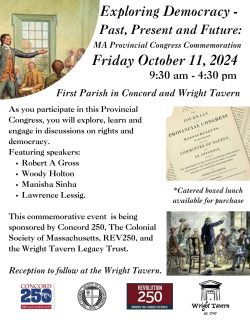 October 11, 2024, marks the 250th Anniversary of the Massachusetts Provincial Congress. To commemorate this occasion and honor our forebearers, the Wright Tavern Legacy Trust is sponsoring a gathering in Concord’s First Parish Meetinghouse and the Wright Tavern next door, where the delegates to the Congress met. This will be a day-long, engaging program. With noted historians to guide us, we will return to this crucial moment in the history of the American Revolution and ask what we can learn from the past. With state legislators joining us, we will examine the state of democratic governance in Massachusetts and the United States today. And, with students and teachers from Massachusetts schools, we will collaboratively explore the future of democracy. Come join us for this remarkable day.